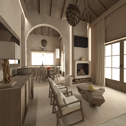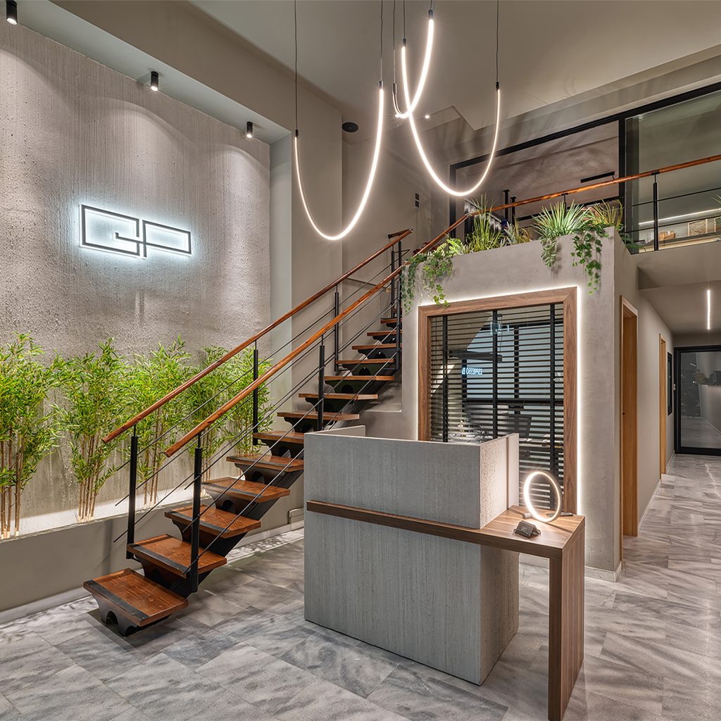 Φυσικά υλικά και σύγχρονες γεωμετρίες συνθέτουν την σχεδιαστική φιλοσοφία. Υφές ξύλου, μεταλλικές λεπτομέρειες και γήινες επενδύσεις, δημιουργούν ένα περιβάλλον κομψών αντιθέσεων.