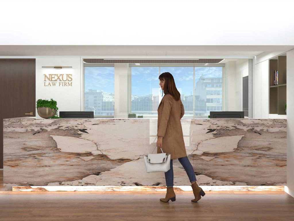 Το έργο αφορά στο σχεδιασμό νέων γραφειακών χώρων της δικηγορικής εταιρείας NEXUS LAW FIRM. Οι νέοι σύγχρονοι γραφειακοί χώροι αναπτύσσονται σε 2 επίπεδα συνολικού εμβαδού 400τμ σε κτίριο γραφείων στο κέντρο της Θεσσαλονίκης, σε μια από τις πιο πολυσύχναστες γειτονιές της πόλης. Τα νέα γραφεία της εταιρείας αποτελούν ένα νέο ορμητήριο για σύνθετα projects, έναν ελκυστικό χώρο συνάθροισης και ανταλλαγής απόψεων, με την απρόσκοπτη θέα προς την πόλη διευρύνοντας νοητά τους ορίζοντες της εταιρείας και των ανθρώπων της. Η αρχιτεκτονική εταιρεία TAKA+PARTNERS στον αρχιτεκτονικό σχεδιασμό και η ΜΑΡΜΟΥΡΗΣ Α.Ε. στην προμήθεια των υλικών, συνέβαλαν στη δημιουργία του project