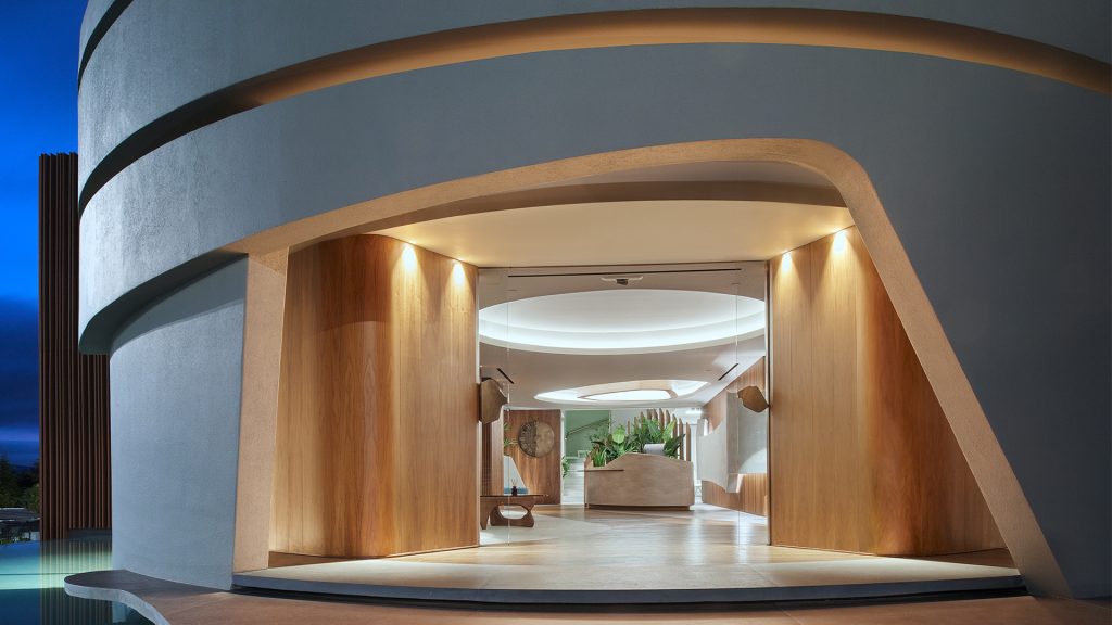 Με ζητούμενο του έργου την ανακαίνιση του lobby και του γραφείου CEO του Ομίλου Μασούτη στη Θεσσαλονίκη, ο κυλινδρικός όγκος που όριζε την υπόστυλη είσοδο στη στάθμη του ισογείου και το διευθυντικό γραφείο στον όροφο με τα περιμετρικά υαλοστάσια, αντιμετωπίστηκε ως καμβάς, ικρίωμα για έναν νέο γλυπτικό χειρισμό. Έτσι, ένα αναδιπλούμενο κέλυφος αγκαλιάζει περιμετρικά τον κύλινδρο διαμορφώνοντας μια νέα σχέση κενού – πλήρους και ορίζοντας εγκοπές και εξάρσεις που καθορίζουν νέες εκδοχές οπτικής επαφής του εσωτερικού με τον εξωτερικό χώρο. Σ’ όλο το έργο υπάρχει διάχυτη η ροϊκή διάθεση που διευκολύνει την κίνηση στον χώρο και επιτυγχάνεται με καμπύλες μορφές.